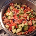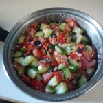 We’ve made greek salad again. This time I was hoping to have leftovers so we made about twice as much. However we brought it to a potluck so it mostly got eaten up anyways. We (I) put a bit too much red wine vinegar in it, so we were sort of left with soup at the end. It also didn’t fit in our metal bowl, so we put it in this pot, perfect for a potluck!